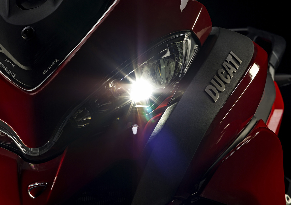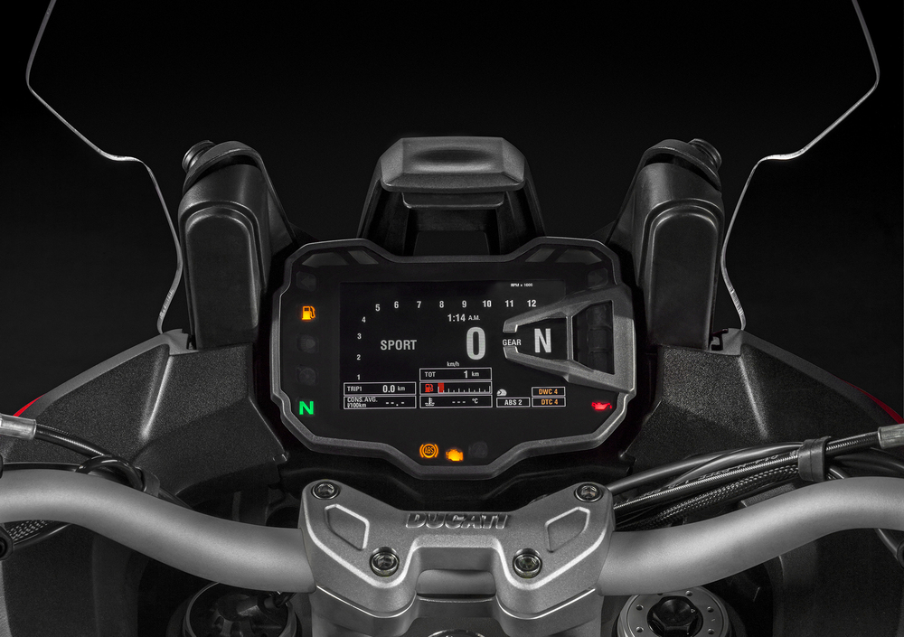 Il parabrezza resta regolabile in altezza con una mano sola (ed è più largo di 4 cm) e sotto la sella si trovano una presa 12v (una seconda è disponibile in zona anteriore) e un connettore USB per il collegamento dello smartphone. E’ infatti possibile, con il Ducati Multimedia System (DMS), collegare il telefono via Bluetooth e utilizzarlo per ascoltare musica o telefonare e, tramite un’apposita APP, per condividere itinerari e dati di viaggio sui social network.