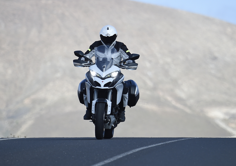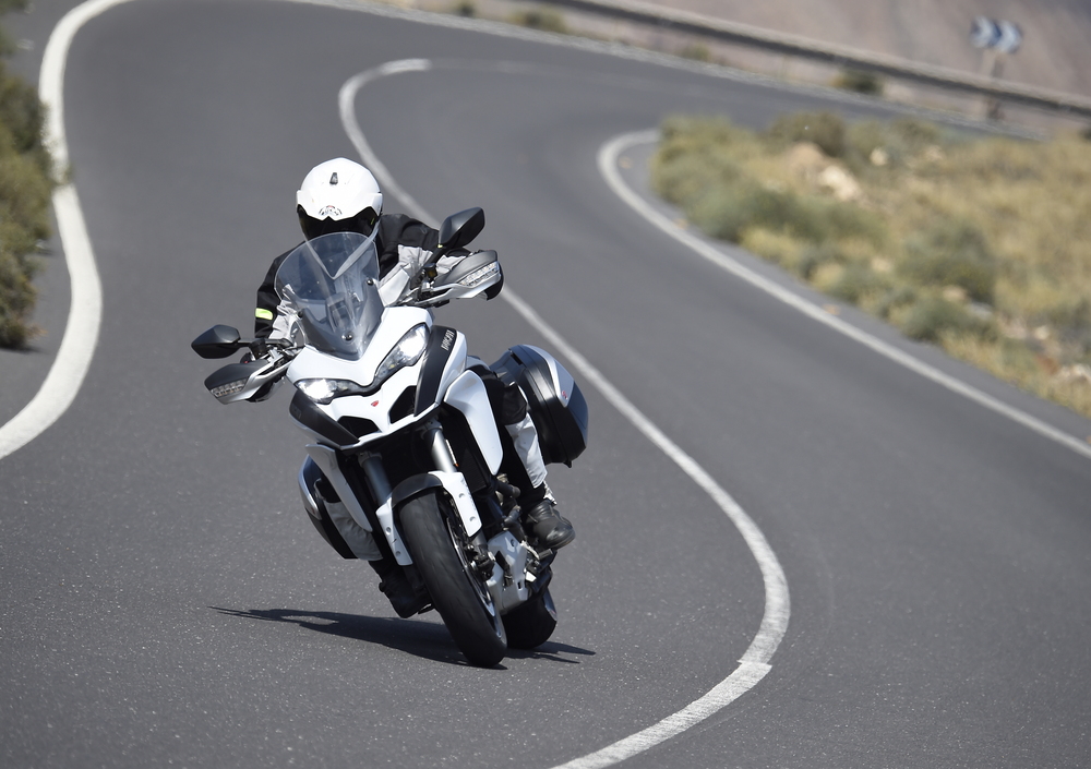 La Multistrada S non si accuccia sulla sospensione, ma resta ferma come su un binario. E’ fatta per divertire tra le curve, e ci riesce benissimo. Il nuovo modello ha studiato anche le buone maniere: digerisce le buche e - chi l’avrebbe mai detto? - se ne va a zonzo a regimi da diesel senza battere un colpo. Allarga di fatto il suo range di utilizzo, che spazia dalla guida da single sui passi di montagna ai viaggi in coppia con la voglia di gustarsi il panorama.