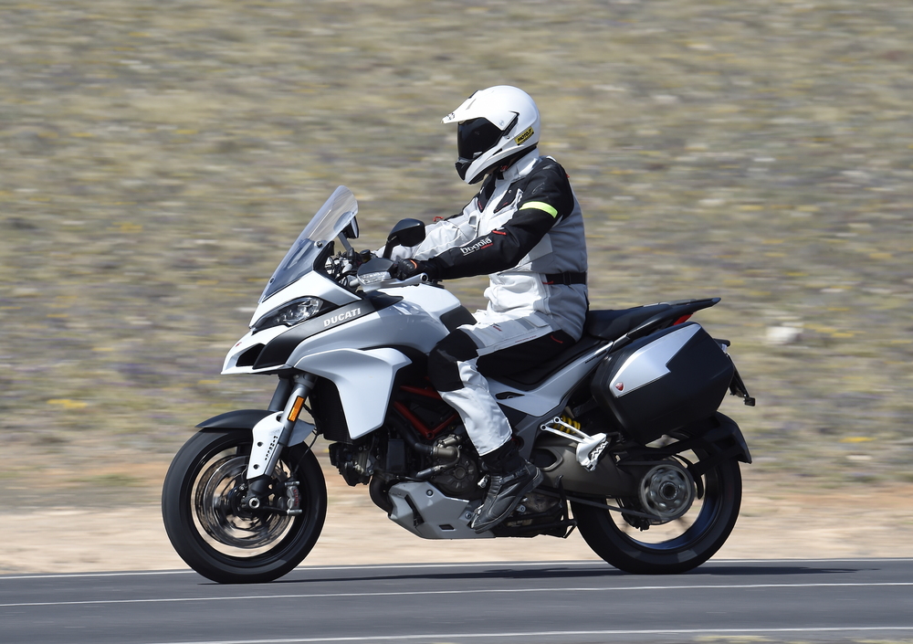 Nel 2015, sulla moto che stiamo provando, il salto è generazionale. Da un lato la Multistrada è davvero tutta nuova. Cambiano infatti il design, l’ergonomia e la ciclistica. Dall’altro debutta l’Inertial Measurement Unit (IMU) Bosch (che migliora la stabilità della moto), mentre il propulsore è stravolto nel suo carattere dall’adozione della doppia fasatura variabile DVT, che lo rende trattabile ai bassi regimi come mai lo era stato un motore Ducati (siamo ora davvero vicini alla regolarità di funzionamento di un boxer BMW; si può scendere fino a meno di 30 km/h in terza senza che ci sia un solo strappo alla trasmissione). In più la versione S ha una dotazione spettacolare, che comprende i fari a LED adattivi, il cruise control, l’evoluzione delle sospensioni semi attive Skyhook e la nuova strumentazione TFT.