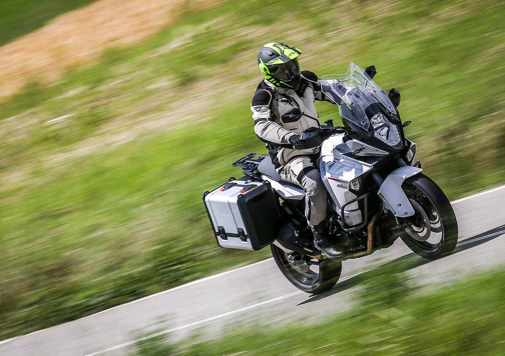 Ha un’ottima protezione aerodinamica. Le vibrazioni sono scarse e compaiono soltanto sopra i 7.000 giri, quindi ad alta velocità (in sesta a 130 indicati il motore è a circa 4.700 giri). La Casa raccomanda di non superare i 150 km/con le borse montate. Abbiamo provato la moto a velocità superiori, fino a circa 185 km/h. In questo frangente si nota una certa leggerezza dell’avantreno, che invita a moderare l’andatura. Senza le borse la situazione migliora nettamente e, anche col passeggero, la 1290 risulta ferma (è evidente in questo caso l’utilità della regolazione elettrica del precarico, che alza il posteriore). La stabilità con le valigie è invece migliorabile e approviamo la scelta della KTM di indicare in 150 km/h la velocità massima da raggiungere in questa configurazione.