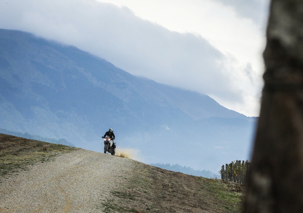 Abbiamo iniziato col percorso fuoristrada e manteniamo anche qui la sequenza delle sensazioni provate in sella alla Enduro 1260. Il manubrio più basso di 3 cm non comporta limitazioni, è infatti sufficiente ruotarlo un po' in avanti per alzarlo quanto basta a guidare bene in piedi sulla grandi pedane da offroad. Con le Pirelli Scorpion Rally (omologate) la Multistrada stupisce sullo sconnesso proprio come faceva la 1200 che abbiamo provato nel recente passato. Le sospensioni semi-attive, con meno escursione ma setting rivisti, hanno una scorrevolezza eccellente. Basta selezionare il riding mode Enduro per affrontare sassi e sentieri smossi con tanta trazione. Il merito va anche all'ottimo DTC, che consente di scaricare la giusta potenza senza castrare troppo la risposta del bicilindrico. L'ABS può essere escluso, ma ve lo sconsigliamo. L'ideale è toglierlo solo al posteriore.