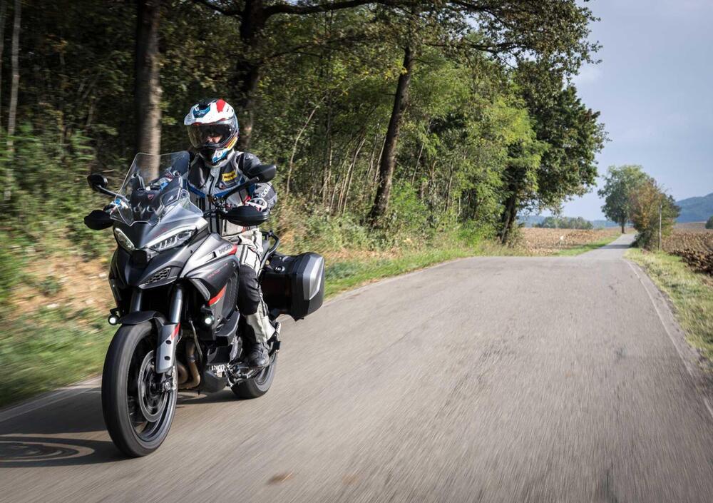 Di serie, al prezzo di 27.590 euro, troviamo tutti gli accessori che ne fanno, appunto, una GT da turismo. Abbiamo le borse laterali basculanti (per eliminare ogni possibile ondeggiamento ad alta velocità), il cavalletto centrale, i faretti a LED, selle e manopole riscaldabili, un nuovo sportello con ventola di raffreddamento sul serbatoio (può essere chiesto da tutti i clienti Multistrada anche sulle precedenti versioni V4, senza alcun costo aggiuntivo). Ci sono anche un nuovo tappo del serbatoio keyless e i sensori della pressione delle ruote.