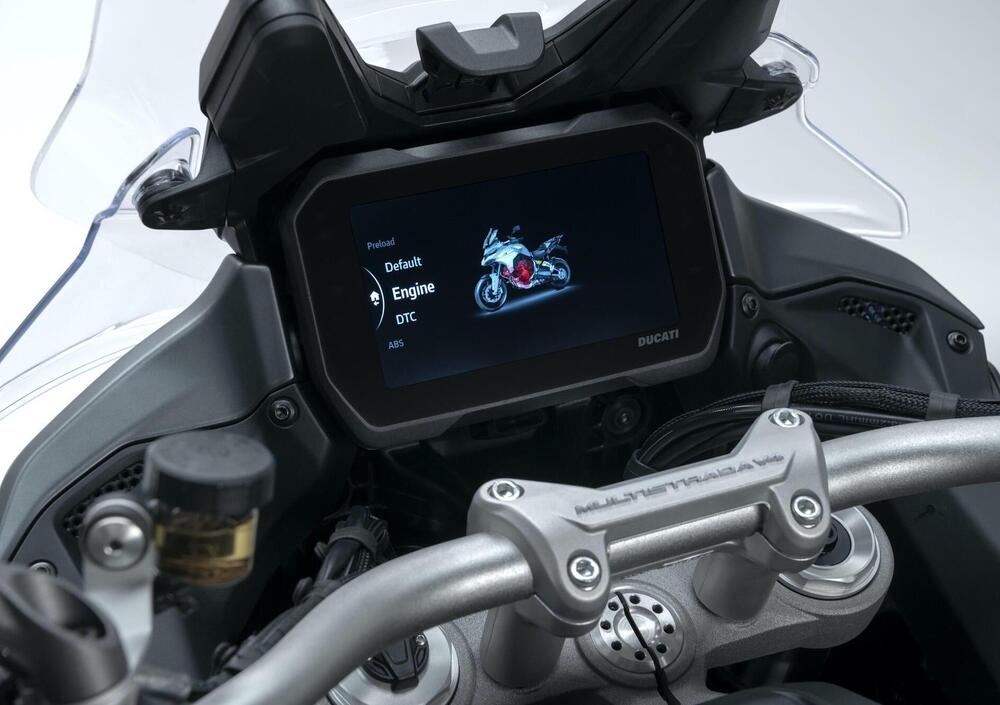 Al fine di migliorare l’esperienza di guida dell’utente, sulla Multistrada V4 i tecnici Ducati hanno rivisto completamente l’interfaccia utente e la grafica del cruscotto (ora multilingua), che sulla Multistrada V4 S è un’unità TFT da 6.5 pollici regolabile nell’inclinazione. Sempre sulla versione S nel blocchetto di sinistra è stato inserito un joystick che permette una rapida e facile navigazione del nuovo menu, studiato per essere ancora più intuitivo. Il nuovo sistema Ducati Connect permette il “mirroring” via Bluetooth e wi-fi di alcune applicazioni del proprio cellulare sul cruscotto ed il controllo attraverso il joystick posizionato sul blocchetto comandi di sinistra. Inoltre, nella parte superiore del serbatoio, è stato ricavato un vano, accessibile tramite uno sportello, nel quale è possibile riporre il proprio smartphone e tenerlo sotto carica grazie alla presenza di una porta USB.