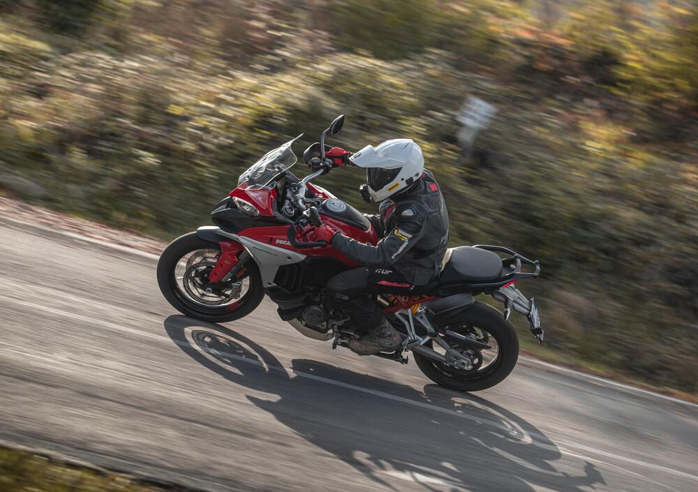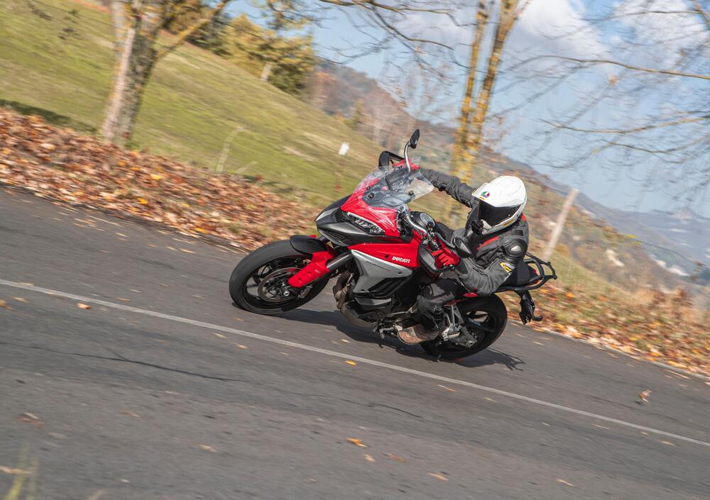 E qui entra in gioco prepotente il nuovo motore V4. Abbiamo letto che non sarebbe più un vero Ducati per via dell’assenza della distribuzione desmodromica. Ragazzi, provatelo! È un Ducati fatto e finito. Certo, ai regimi più bassi ha perso la ruvidità dei V2 di Borgo Panigale e ai medi è sicuramente più gentile. I suoi 170 cavalli infatti non sono mai imbizzarriti e fuori controllo, merito di un’ottima gestione elettronica del gas e degli evoluti controlli dinamici. Ma, se spalancate il gas, si decolla! I 1.158 cc regalano prestazioni entusiasmanti. Il V4 è regolare a 2.000 giri, spinge con forza – tanta forza – dai 4 ai 7.000 giri e poi boom: ti proietta a oltre 10.000 giri con una spinta inesauribile, amplificata dalle cambiate da MotoGP del cambio assistito elettronicamente (di serie sulla S della nostra prova). I rapporti sono molto ravvicinati e con una prima bella corta, perfetta in città o nel fuoristrada. Le cambiate sono un po’ ruvide solo se si pretende di usare il quick shift elettronico ai regimi medio-bassi.