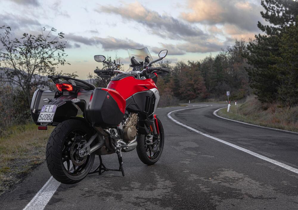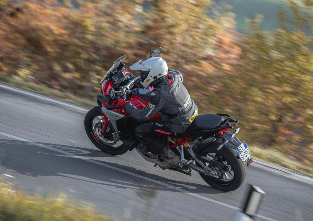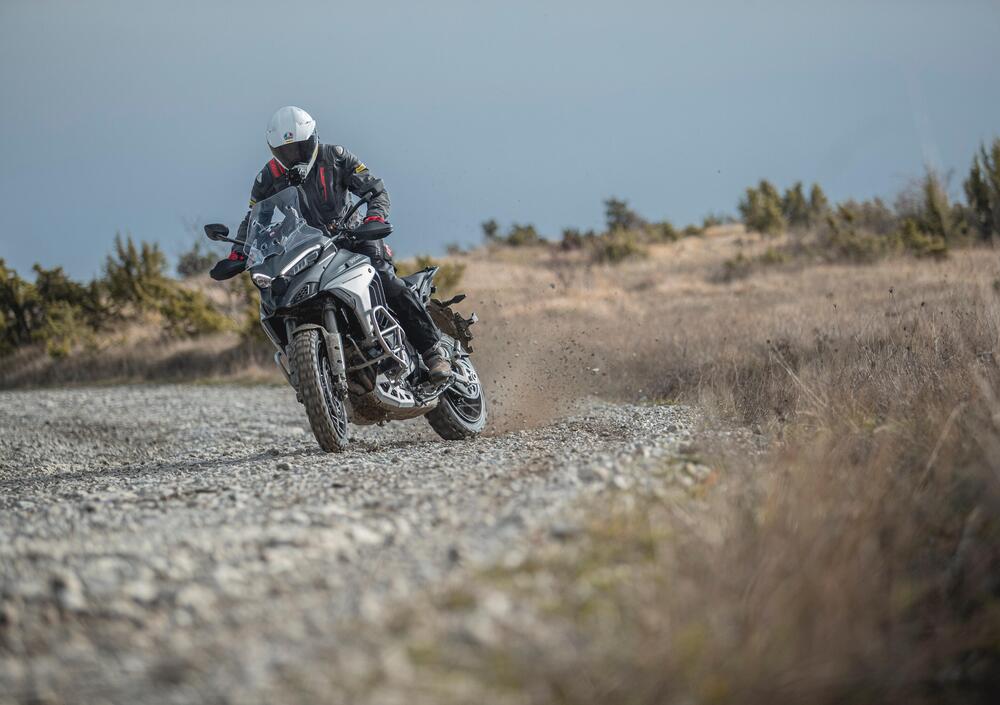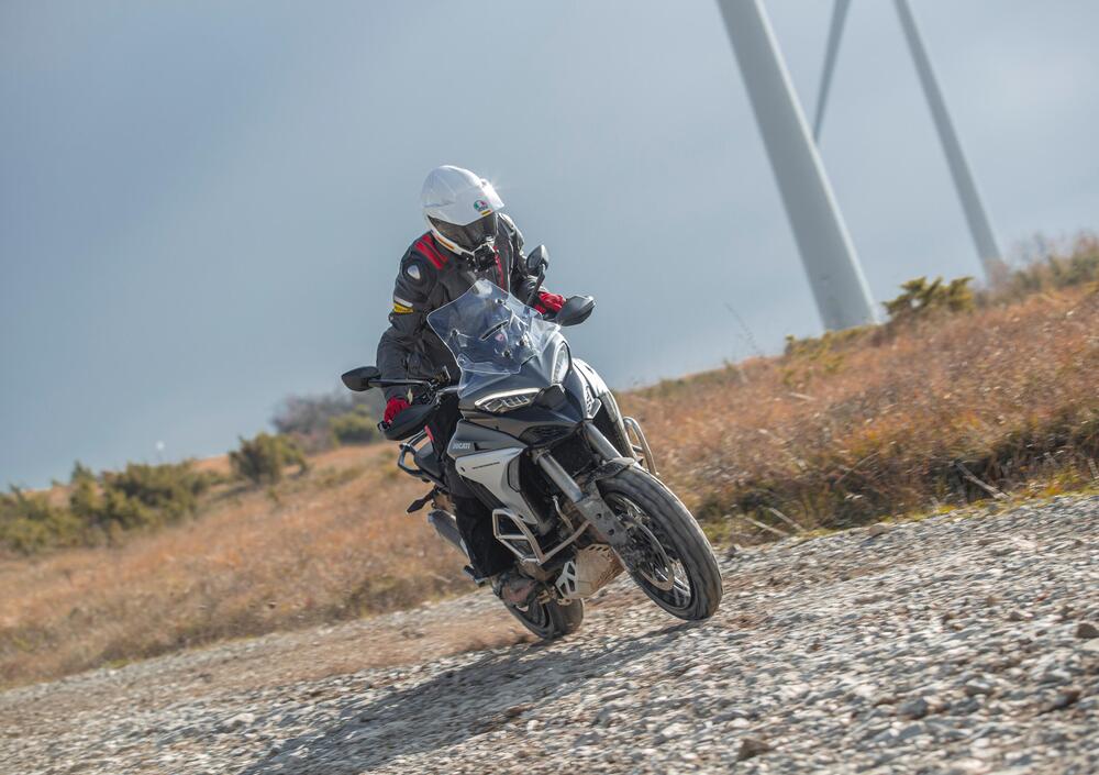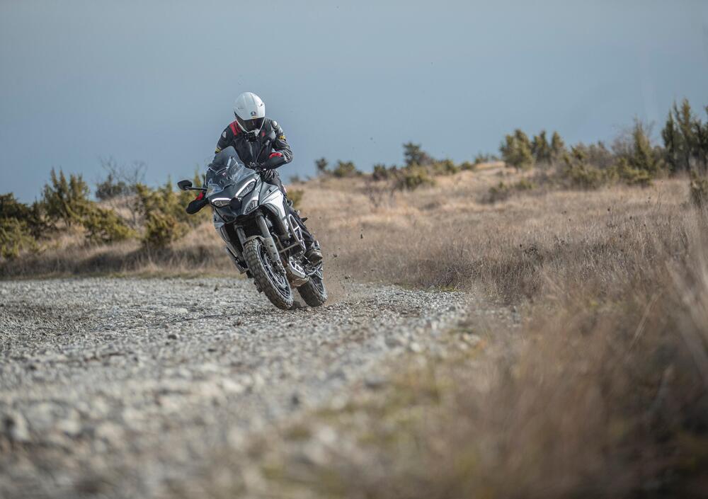 Risultato? La Multi V4 è meno rapida a scendere in piega, ma molto più intuitiva e facile. L’agilità persa con la ruota anteriore più grande è recuperata grazie alle nuove quote ciclistiche e al peso inferiore. Su asfalto il divertimento in curva è ancora di assoluto livello e sulla S abbiamo apprezzato anche le sospensioni elettroniche e l’impressionante reparto freni, che davanti ha enormi dischi da 330 mm di diametro con pinze Brembo Stylema.