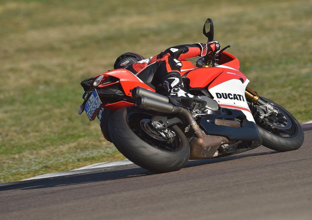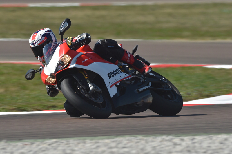 La ciclistica è perfettamente accoppiata all’elettronica di gestione del motore e soprattutto della dinamica di guida. Avendo girato con pneumatici meno specialistici e soprattutto non proprio di ultima generazione, le Pirelli Diablo Corsa (scelta difficilmente condivisibile viste le ottime prestazioni delle Pirelli Diablo Corsa II di recente presentazione) la valutazione risente dell’accoppiata ciclistica/gomma. Sicuramente un profilo del pneumatico più pistaiolo e quindi svelto avrebbe reso ancora più agile la già veloce Panigale, che comunque ha dalla sua un comportamento che infonde fiducia, grazie alla stabilità ineccepibile e a una certa accessibilità della ciclistica, che aiuta il pilota ad andare forte senza richiedere concentrazione e precisione assolute. Insomma, una moto che permette di arrivare al proprio limite senza dover giocare Jolly.