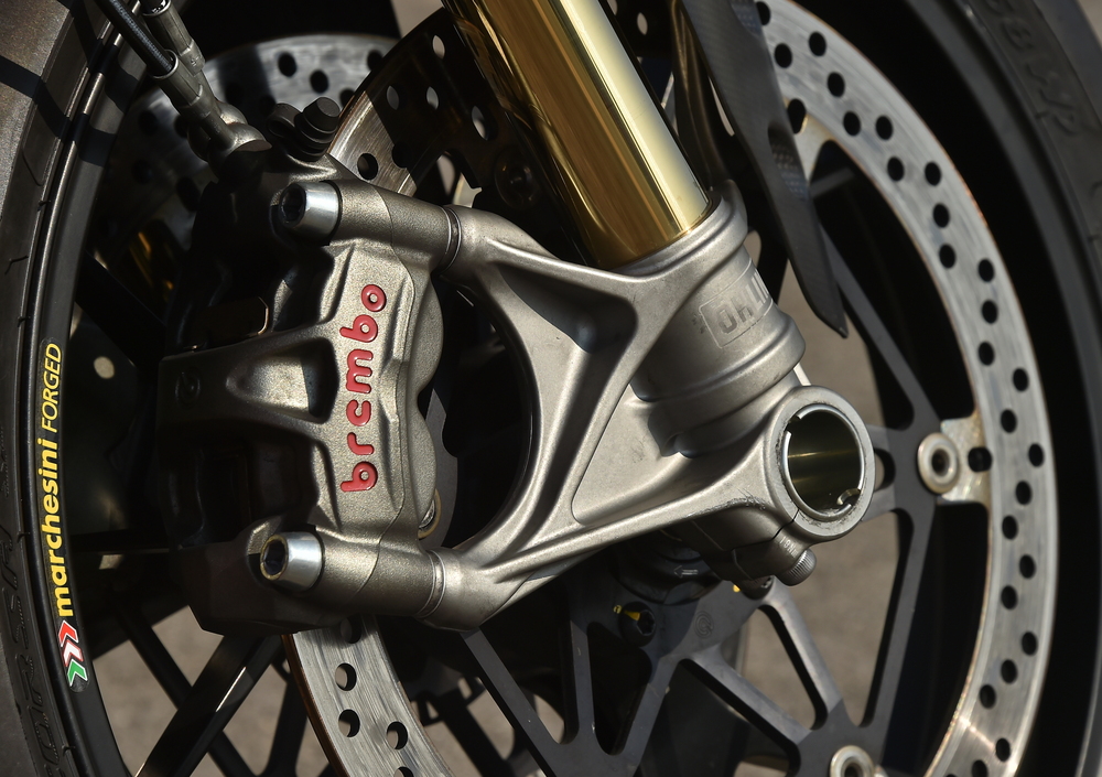Data la destinazione d’uso estremamente specifica, e quasi esclusivamente pistaiola, la Panigale R non è dotata delle sospensioni semiattive Öhlins event-based, ma conta su più specialistiche unità meccaniche della Casa svedese. All’avantreno troviamo una forcella NIX30 a steli rovesciati da 43 mm con trattamento superficiale TiN per gli steli, naturalmente completamente regolabile, mentre al posteriore, in posizione orizzontale ed ancorato a leveraggi progressivi, lavora un monoammortizzatore TTX 36.
