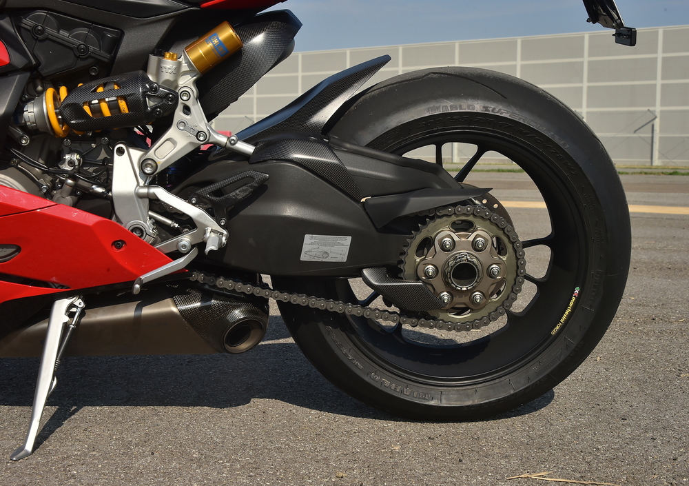 Il forcellone in alluminio ha il perno regolabile su quattro posizioni; anche il cannotto di sterzo – come da buona tradizione inaugurata sulla 916 – è ad inclinazione variabile. In questo caso attraverso boccole dedicate che consentono di avanzare l’asse di 5 mm rispetto alla posizione di default (con un corrispondente aumento dell’interasse, che passa da 1.437 a 1.442mm) aumentando la stabilità in generale, ma soprattutto negli ingressi in curva a freni tirati.