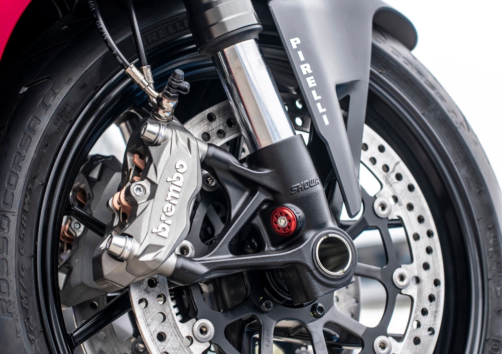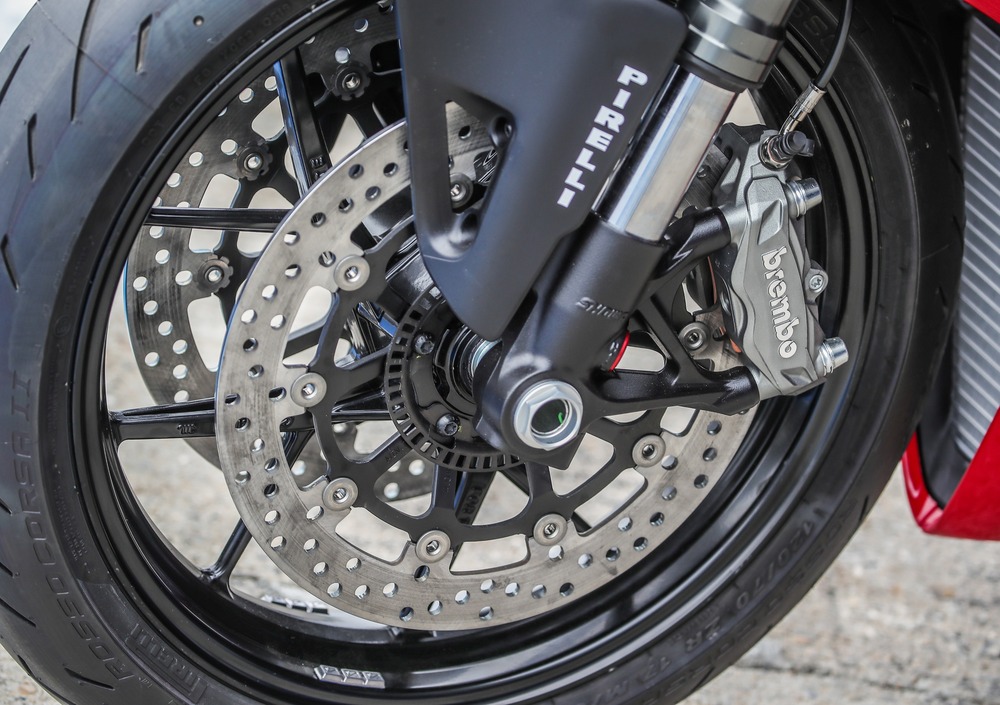 L’impianto frenante come scritto sopra è dotato del nuovo ABS Cornering EVO, che agisce sulla coppia di dischi da 320 mm accoppiati a pinze Brembo M4.32, dietro troviamo un disco da 245 mm, frenato sempre da una pinza Brembo. I tre livelli disponibili permettono di configurare l’impianto in base al tipo di utilizzo della Panigale V2. Il livello “3”, è tarato per un uso stradale, o in condizioni di grip scarso, ed evita anche il sollevamento della ruota posteriore nelle frenate più violente. Il livello “2” mantiene la funzionalità “Cornering” escludendo quella “anti lift”, ed è adatto all’utilizzo in pista da parte di un pilota amatoriale, che può sfruttare anche la funzionalità “slide by brake” (l’ingresso in curva in leggera derapata).