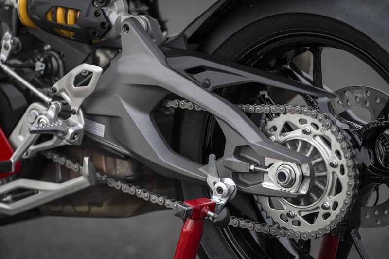 Il forcellone bibraccio è ispirato nel design a quello della Panigale V4 e offre gli stessi benefici in termini di stabilità in uscita di curva e feeling nella guida in pista, contesto in cui la nuova Panigale V2 può montare senza modifiche le stesse misure degli pneumatici impiegati nel mondiale Supersport (180/60-17), al posto del 190/55 di serie.