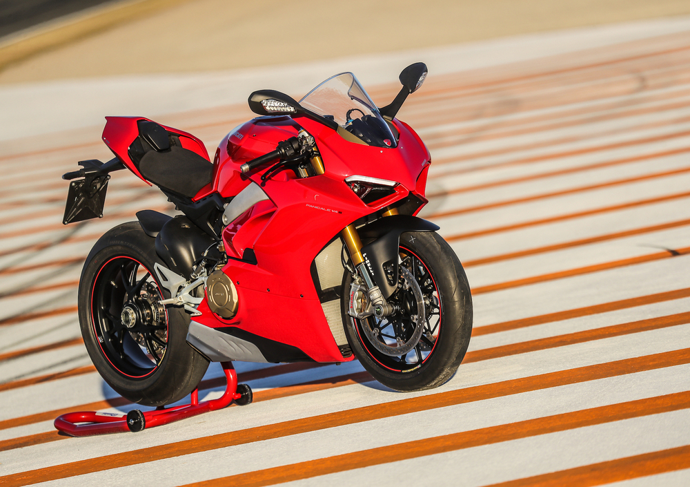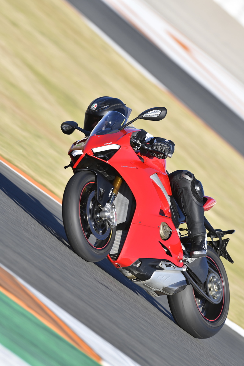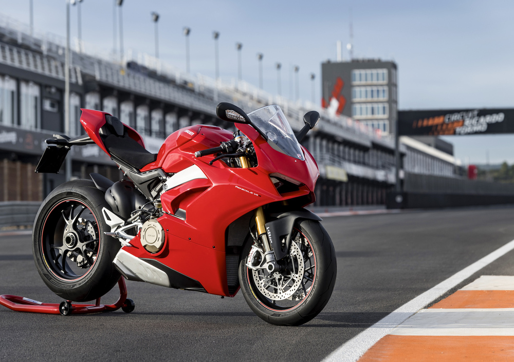 La cilindrata è di 1.103 cc, uno sforamento verso l’alto della cubatura totale prevista per la versione che si cimenterà nel WSBK, che garantisce curve di coppia e potenza più adatte all’utilizzo stradale. Trattandosi di Ducati, la distribuzione di conseguenza è rigorosamente desmodromica, con catene di distribuzione del tipo “silent”, caratteristica che permette di adottare alberi a camme con fasature decisamente spinte e aperture/chiusure delle valvole da 34 e 27,5 mm (rispettivamente per aspirazione e scarico): poco praticabili con le normali molle, a regimi che su questo "giocattolo" oltrepassano i 14.000 giri/min. I numeri parlano chiaro e fanno impressione: 214 cv (157,5 kW) a 13.000 giri e 12,6 kgm di coppia (124 Nm) a 10.000 giri, tenendo ben presente l’omologazione Euro 4 e il fatto che questo mostro con un rapporto potenza di 1,1 cv per kg è omologato per girare su strada. Se poi intendiamo utilizzare la nostra V4 solo in pista, allora i cavalli possono arrivare a ben 226(!!!), semplicemente montando lo scarico completo Akrapovic, con relativa mappatura della centralina e filtro aria specifico.