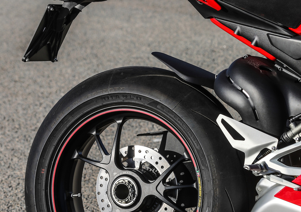 La nostra V4 S, così come la V4 Speciale, monta una coppia di cerchi forgiati in alluminio a differenza della V4 che ne monta una coppia realizzati per fusione; la misura è quella standard per le sportive attuali, cioè 17 pollici; quello che è invece inusuale è la misura dei pneumatici, non tanto quelli anteriori, da 120/70, quanto per i posteriori, che vantano una misura inedita per un pneumatico omologato stradale, ovvero quella 200/60 ampiamente testata nel Mondiale SBK da Pirelli, che è fornitore di primo equipaggiamento. Infatti le nostre Ducati V4 S montano le nuove Pirelli Supercorsa SP, pneumatici omologati per l’utilizzo su strada, ma che, come potete leggere qui sotto, si sono comportati alla grande anche sull’asfalto del Circuito di Valencia
