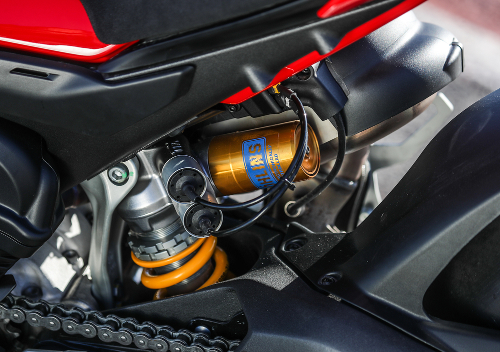 La Panigale V4 S protagonista della nostra prova è equipaggiata con una forcella Öhlins NIX-30 e un mono TTX36 sempre del medesimo marchio, a differenza della versione Standard, che prevede una forcella Showa BPS da 43 mm, ammortizzatore di sterzo e mono Sachs. Le sospensioni della V4 S sono identiche a quelle che equipaggiano la versione V4 Speciale, e sono caratterizzate dalla gestione elettronica affidata al sistema di controllo di seconda generazione Öhlins EC Smart 2.0. Quindi, selezionando le tre differenti modalità di guida, le sospensioni garantiscono un assetto ottimale in base alle condizioni d’uso