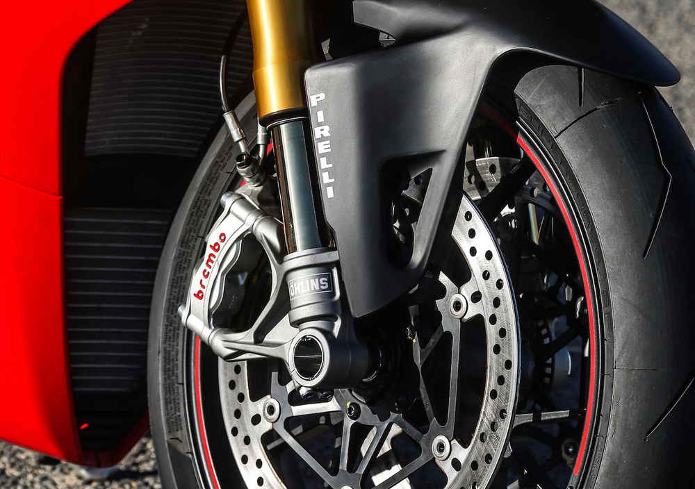 L’evoluto ABS Cornering EVO che equipaggia la Panigale V4 in tutte le tre versioni agisce ora su inedite pinze anteriori Brembo Stylema, evoluzione delle performanti M50: più compatte e leggere (-70 gr), queste differiscono anche nella ventilazione interna dei quattro pistoncini da 30 mm di diametro, che agiscono su una coppia di dischi da 330 mm (il posteriore da 245 mm, con pinza a due pistoncini).