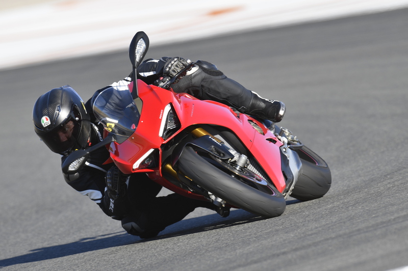 Impressionante il comportamento delle Pirelli Supercorsa SP di primo equipaggiamento, in completa sintonia con la ciclistica svelta e reattiva della Panigale V4; non per niente sono state sviluppate appositamente per questa moto. Elevatissimo il grip offerto ai massimi angoli di piega, ci hanno permesso di andare a strisciare gli slider sui gomiti in più di una occasione, dialogando perfettamente con l’elettronica della V4 e le sue richieste di “perdite di aderenza controllata”, mentre non faticano a mettere a terra la spaventosa potenza del “Desmosedici Stradale” in uscita di curva, e soprattutto sul rettilineo principale.