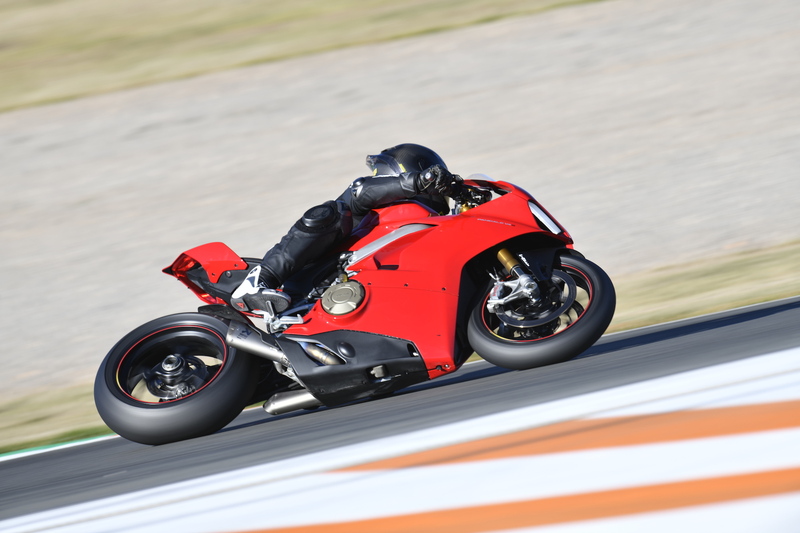 Con il V4 che canta tra gli 8 e i 10.000 la V4 viaggia già fortissimo, allungando oltre è impressionante, con la moto che fa di tutto per scapparti da sotto il sedere! Però lo fa in maniera composta, senza scuoterti da una parte all’altra e senza creare difficoltà ulteriori rispetto a quelle legate alle velocità altissime che raggiunge nello spazio di un fazzoletto, e alle conseguenti frenate che richiedono concentrazione e riflessi sempre pronti. Anche senza giocare con le regolazioni dei vari controlli, e rimanendo in pratica su quelli standard, la Panigale V4 fa di tutto per andare forte senza complicare più di tanto la vita al pilota: certo, la conformazione del tracciato di Valencia, con le sue continue ripartenze, e gli oltre 200 cv della belva, mettono a dura prova il fisico, ma siamo certi che su una pista più veloce e guidata la V4 si farebbe apprezzare ulteriormente.