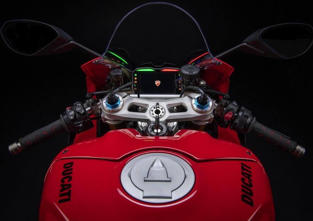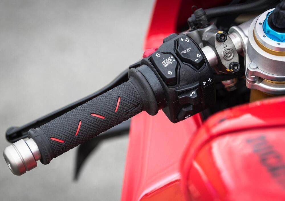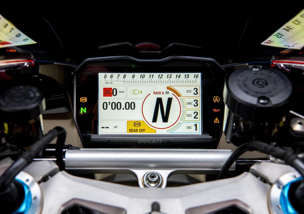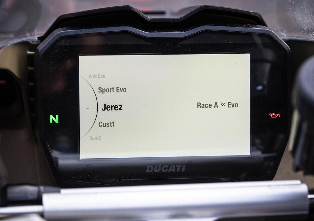 I quattro riding mode (Race A, Race B, Sport e Street) sono preconfigurati con valori decrescenti di aggressività e prestazionalità, ma naturalmente tutti i parametri sono configurabili, al di là dei valori di default, utilizzando i tasti sul blocchetto sinistro e il cruscotto TFT dotato di una nuova modalità di visualizzazione definita “Track Evo”, molto simile a quello utilizzato sulle MotoGP Ducati, con il contagiri a barra in alto, la marcia inserita al centro e quattro settori di diverso colore che segnalano il valore di configurazione ma soprattutto, accendendosi, l’intervento dei singoli controlli elettronici DTC, DWC, DSC, EBC. In questo modo il pilota ha la possibilità di vedere quale controllo sia intervenuto, e quindi di capire se modificarne la taratura o adattare il proprio stile di guida.