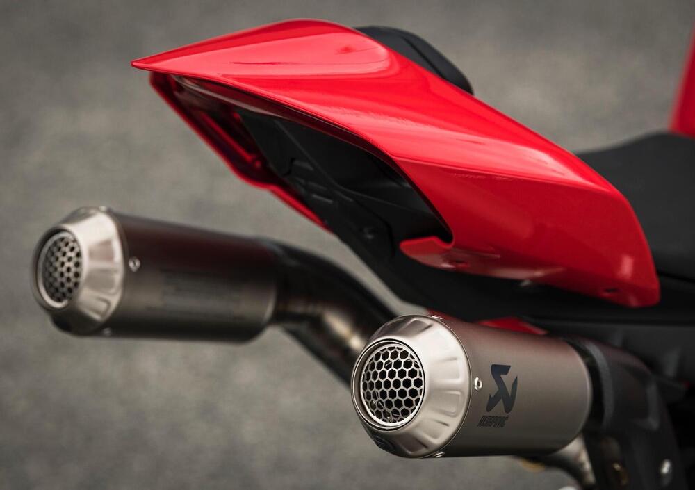 In particolare, i due scarichi sviluppati con Akrapovič consentono di aumentare sensibilmente la potenza massima riducendo il peso, mantenendo comunque (con uno dei due) un livello di rumorosità che consente di affrontare i track day anche sulle piste con restrizioni più pressanti. Il primo modello, con silenziatori alti che passano a lato della coda, rientra infatti nel limite di 105 dB (102 adottando il dB-killer) offrendo però un aumento della potenza di 12,5cv per un totale di 228, con il valore di coppia massima che sale fino a 131 Nm riducendo il peso di 5 kg.