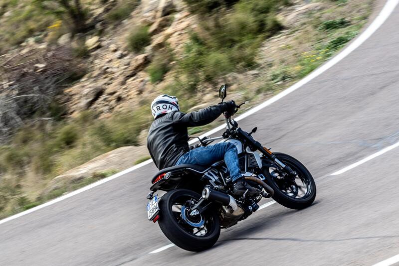 Usciamo dall'ambito urbano per andare a cercare qualche curva: qui il comportamento dell'avantreno che avevamo trovato piacevolmente leggero in città sfodera un rigore direzionale perfettamente accordato all'appoggio della gomma posteriore da 180. Ci si diverte senza troppi precontetti, con la mente libera di gustarsi un bilanciamento ciclistico da vera Ducati, merito anche delle gomme Pirelli di primo equipaggiamento. E non potrebbe essere altrimenti dato il largo manubrio e una ciclistica che perdona correzioni o esitazioni, pronta anche a farsi strapazzare nei cambi di direzione.