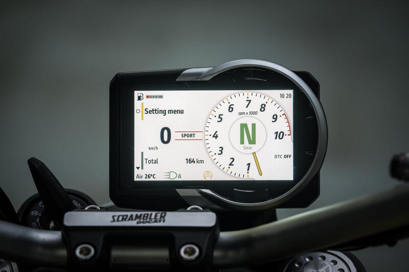 Ma è inedito anche tutto l'impianto elettrico, da cima a fondo, sia perché l'intero impianto di illuminazione è a LED, sia perché viene introdotto il dashboard TFT da 4,3 pollici che permette anche la gestione delle connettività. La grafica è quella tipicamente Ducati e le informazioni/settaggi sono gestiti in modo intuitivo attraverso il blocchetto di sinistra: sopratutto è possibile cambiare Riding Mode (ne parliamo tra poco) anche in movimento, troviamo inoltre una nuova IMU a sei assi, elemento indispensabile quando si desidera implementare controlli elettronici evoluti che passano pure dal ride by wire, dall'ABS cornering che abbiamo già citato e dal Controllo di Trazione su 4 livelli (disinseribile) che tiene conto anche dell'inclinazione del veicolo.