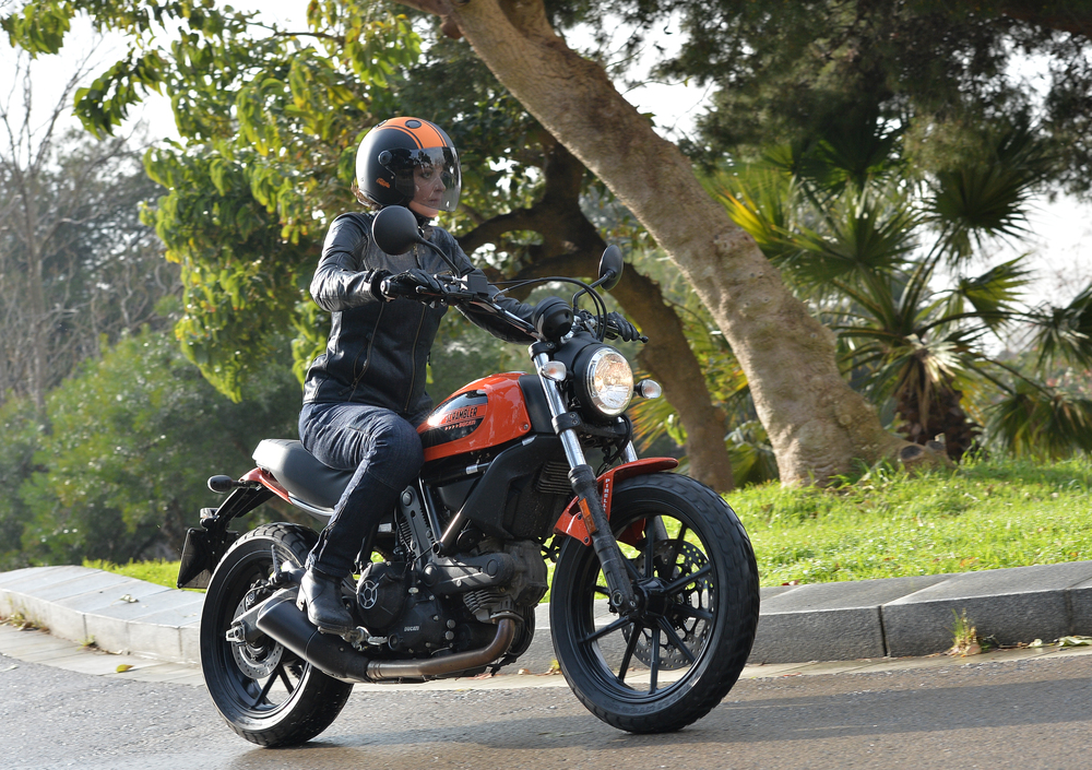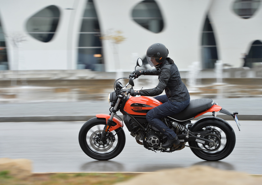 Si avverte subito, non appena in sella, in grande feeling dato dalla sella bassa (790 mm), dal manubrio alto e largo e dalla posizione di guida bella dritta. Questa Scrambler si lascia dare subito del tu. Bisogna solo prestare un attimo di attenzione alla frenata, sulle prime forse un po' decisa per un principiante, all'anteriore ma anche al posteriore, solitamente più blando. Comunque sia, il Santo ABS ci toglie dai guai in caso di frenate di emergenza o terreni ostili.