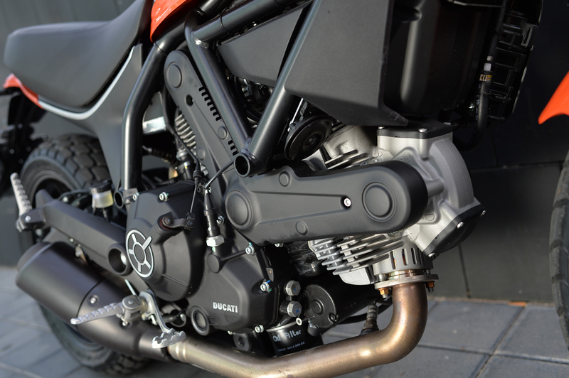 Per portare la Scramblerina in target entry level, a qualcosa si è ovviamente dovuto rinunciare: la forcella a steli rovesciati diventa di tipo tradizionale; il forcellone in acciaio ha un design classico. Nuovi il serbatoio a goccia, e il logo che ruba lo stile vintage dalle gare di BMX con le stelline, in questo caso quattro, a sottolineare la cilindrata di 400 cc. Eh già, il motore è un bicilindrico da 399 cc e 41 cavalli: le prestazioni sono dimezzate di netto, per andare incontro ad un differente tipo di pubblico.