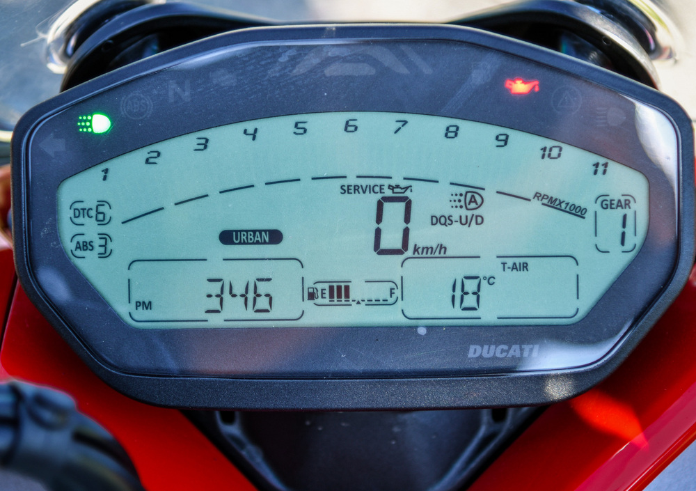 Oltre a contachilometri, tachimetro e contagiri, la strumentazione LCD visualizza anche il Riding Mode oltre ai livelli di DTC ed ABS impostati nonché, finalmente, il rapporto inserito grazie all’arrivo dell’apposito sensore sul cambio, necessario peraltro all’adozione del quickshifter – attivo sia in innesto che in scalata – che viene proposto come optional sulla versione base e di serie sulla “S”. Non mancano informazioni riguardanti la temperatura del liquido di raffreddamento e quella ambientale, i consumi medio e istantaneo, la velocità media, l’ora e la durata del viaggio tanto per farsi passare il tempo nelle trasferte autostradali. E per i più smanettoni c’è anche il cronometro per prendersi i tempi sul giro.