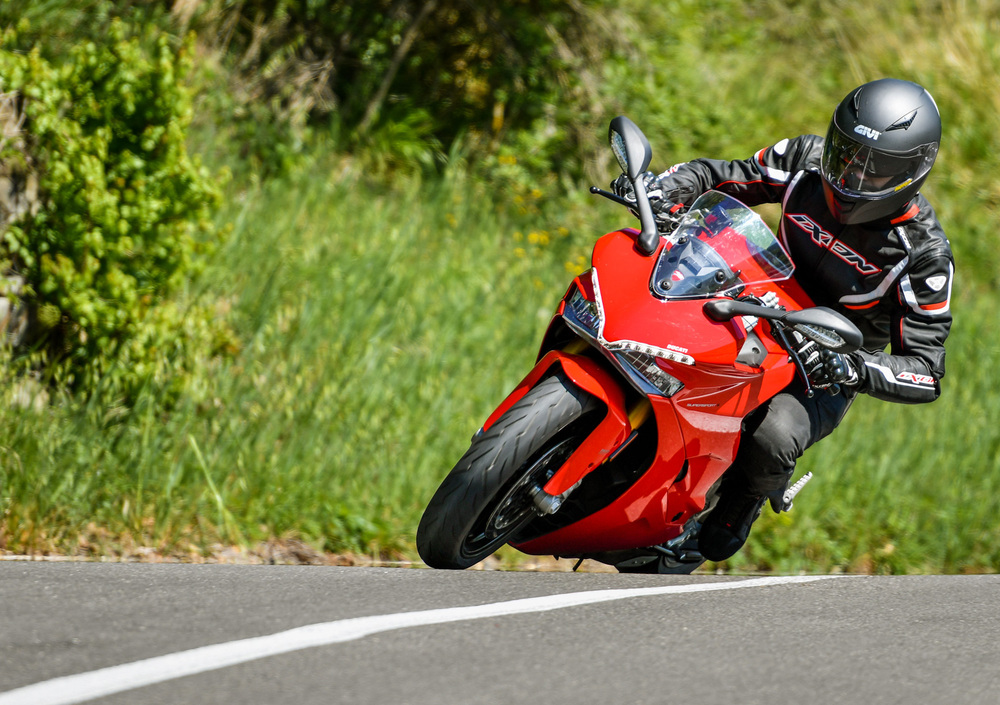 Il motore è degno compare della situazione: pastoso e regolare nell’erogazione, con l’arrivo dell’Euro-4 ha il solo, già citato, difetto del calore trasmesso perché l’impressione è che anche la ruvidità subito dopo l’avviamento trovato sulla famiglia Hyper sia sparito. Dolce, potente, con una bella schiena, gira pulito dai 2.000 in su con poche vibrazioni e ancora meno drammi. Non vi immaginate botte di coppia o impennate indesiderate: con il 939 si fa strada, efficaci e sorridenti. Come abbiamo già detto per le cugine con lo stesso motore, sulla SuperSport si riscopre il piacere di spalancare il gas anche per chi non sia dotato della mitologica “visione rallentata” dei piloti.