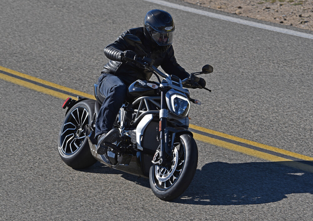 Il motore non ha vibrazioni, piuttosto lo si sente pulsare vivo a ogni richiamo dell’acceleratore. Ha una tonalità di scarico eccitante, piena e cupa sin dai regimi più bassi nonostante l’omologazione Euro 4. La risposta dell’acceleratore è vellutata e testimonia una gestione davvero a punto del ride by wire. Delle tre mappe la Touring è la migliore, mentre la Sport trasforma i 156 cavalli in iene affamate di curve. Supera il nostro esame a pieni voti il sistema DVT: sulla XDiavel la fasatura variabile compie uno step ulteriore rispetto a quanto abbiamo visto sulla Multistrada DVT; è infatti sparito quel gradino, leggero ma percepibile, nell’erogazione intorno ai 3.500 giri. Il Testastretta evidenzia una splendida regolarità di funzionamento sin da 2.000 giri. Ma quello che più stupisce è la gran botta di coppia che si scatena dai 3 ai 5.000 giri. In questo range la XDiavel spinge come una vera bestia e allunga le braccia a ogni rotazione del polso destro. Oltre questo regime ovviamente le prestazioni crescono ulteriormente, ma questa versione del bicilindrico desmo entusiasma soprattutto per la risposta ai medi.