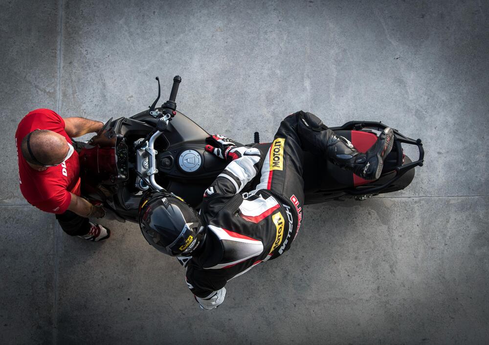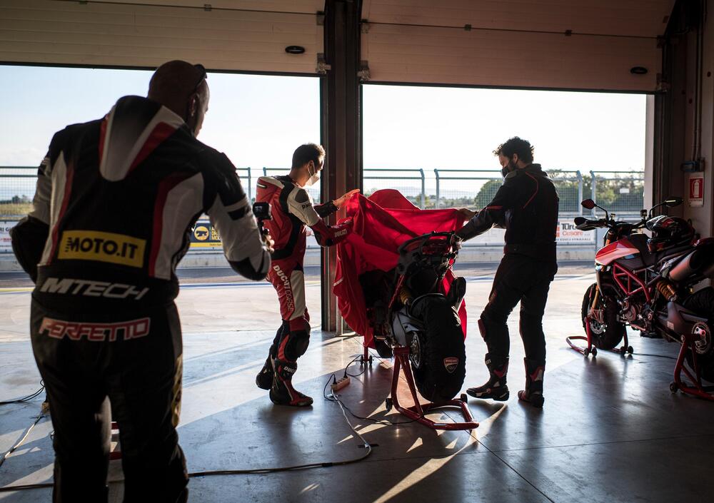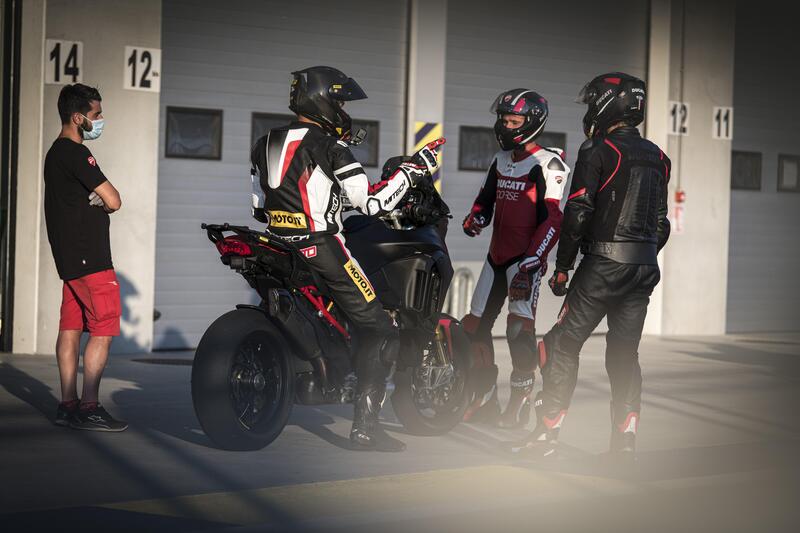 "Hai un'ora, è tutta per te. Basta chiacchiere ed entra in pista. Vogliamo sapere cosa ne pensi". Giulio Fabbri (Responsabile della comunicazione di Ducati) è perentorio e io non me lo faccio certo ripetetere. Indosso i guanti, chiudo la visiera e accendo la telecamerina sulla mentoniera del casco. Guai a perdersi questo momento! Intanto i meccanici Ducati levano le termocoperte, che scoprono gigantesche gomme Pirelli Slick. I numeri non li dicono, ma il posteriore è minimo da 200. Ospitato alla grande dal forcellone monobraccio (al posto di bibraccio della Multi V4 che conosciamo).