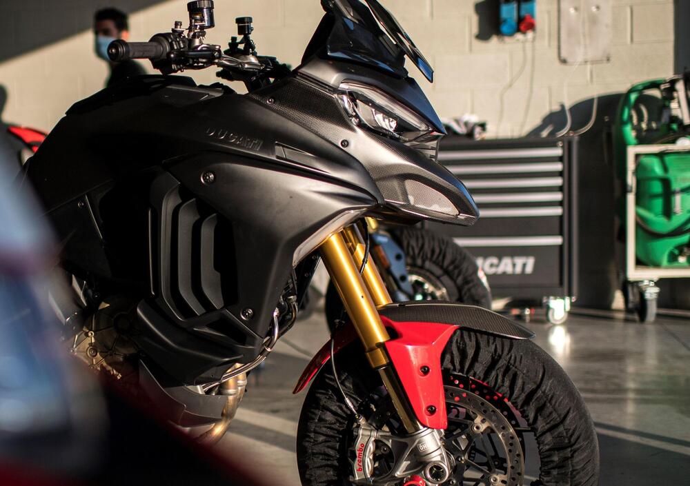 Un'ora al tramonto. Un'ora soltanto, che ti basta però ad accelerare le pulsazioni, a sudare freddo. E a scoprire il nuovo limite sportivo delle crossover moderne. Ducati ha infatti regalato a Moto.it un'anteprima davvero esclusiva: la prova in circuito della Multistrada V4 Pikes Peak. Non vi nascondo l'emozione provata nel trovarmi davanti alla Pikes Peak, da solo con gli uomini Ducati e i fotografi. Non la solita presentazione stampa di uno o due giorni con i giornalisti delle altre testate. No, qui siamo soli io e lei. Camuffata, senza targa e frecce, senza grafiche. Si tratta di una preserie, utilizzata per i test dai collaudatori della Casa di Borgo Panigale. Roba che se la sdrai, sono guai seri. Non posso avvicinarmi troppo con la telecamerina, vietatissimo fare riprese da vicino. Non tutti i dettagli - mi dicono - sono definitivi.
