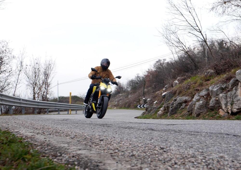 La piccola 125 è stretta tra le gambe, grazie ad un serbatoio che negli ingombri e nelle forme ricorda quello di una Moto2 ed è molto molto agile tra le curve grazie al suo peso ridotto. Se a primo impatto può sembrare "piccola" in realtà la triangolazione pedane-sella-manubrio non lo è ed anzi sembra di essere in sella ad una moto di cilindrata più grande.
