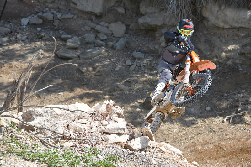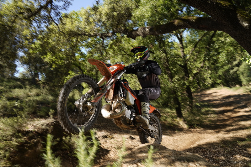 Stesso discorso è stato fatto sul mono che si abbina e lavora in grande armonia con la WP XPLOR, regalando a chi sta in sella grande tranquillità. Dal punto di vista motoristico la piccola 250 se la tieni mansueta è docile, ma se le tiri il collo e la fai arrabbiare allora ecco che si scatena. Lo spunto all’inizio è quanto basta per saltare su dallo scalino in mulattiera, altrettanto per farsi proiettare fuori dalle curve in fettuccia, ma se la fai girare in alto, si distende che è un piacere. La 350 si conferma essere il giusto compromesso tra potenza e bilanciamento generale. Nata per una sfida del mercato, è rimasta nei cuori degli enduristi (anche nel mio) perché è la 4T che più ti diverte e meno ti stanca. Se ti serve coppia ne hai, ma se vuoi smanettare non ne hai troppa. La trazione, in particolare sul brecciolino secco trovato qui in Spagna, sembra non mancare mai, e se inserisci anche il traction control allora sembra proprio di curvare sull’asfalto.