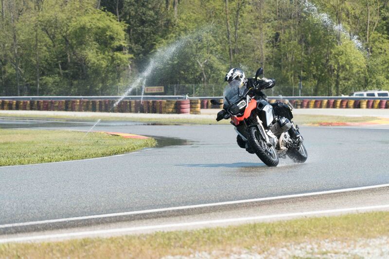 Le Heidenau sono, tra le gomme di questo test, quelle dall'impronta più votata all'offroad e questo si avverte nettamente nella guida sul bagnato. La sicurezza non viene mai meno, ma il grip del tassello pronunciato invita a una guida più rotonda e ad angoli di piega meno accentuati. Il comportamento in frenata è rassicurante e fa intervenire correttamente l'ABS. La trazione in uscita dalle curve è invece solo discreta e chiama spesso in causa il controllo di trazione.