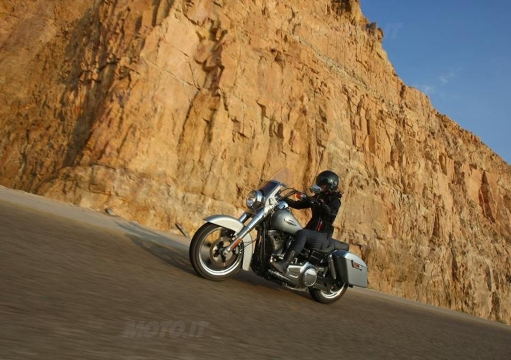 Me li godo comodamente appoggiata alla sella two-up, con le gambe allungate fino alle "pedanone" poggiapiedi rivestite in gomma. Ottimo accorgimento, quello della gommatura, perché in accelerazione è facile scivolare indietro, per chi è poco forzuto come me, e soprattutto perché isola un po' dalle "famose" (e tanto amate dagli Harleysti puri) vibrazioni del bicilindrico di Milwaukee; vibrazioni in realtà quasi inesistenti sulla Switchback – come del resto sulle altre Dyna – con la quale si evitano formicolii indesiderati anche dopo molte ore in sella.
