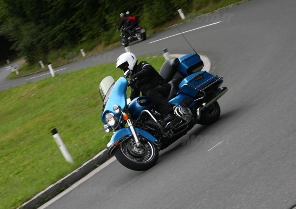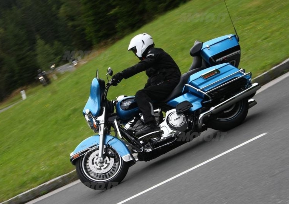 Posizione di guida da Pascià, vibrazioni limitate e cruise control rendono il viaggio autostradale molto piacevole. Ma ad un certo punto dobbiamo e vogliamo abbandonare le strade veloci, per cui gli ultimi 200 km ce li spariamo su strade statali (di montagna), con sorpresa finale di un bell’anticipo di autunno piovoso. La musica proveniente dalle casse dello stereo fa da sottofondo, mentre la Electra danza tra le curve. È quasi imbarazzante come si riesca a guidare bene e con soddisfazione questa H-D dalle forme e dal peso abbondanti, anche tra le curve in saliscendi di una strada di montagna….e sul bagnato.