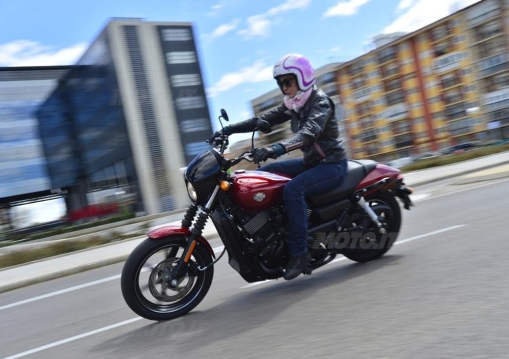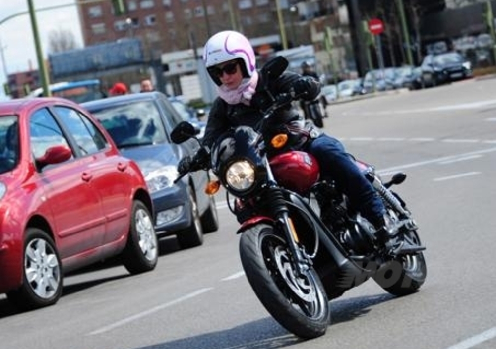 All’avvio del motore il rombo dello scarico lascia subito trasparire la grinta del nuovissimo propulsore Revolution X, scattante e con un’erogazione sempre lineare, racchiuso in uno snello telaio a doppia culla anch’esso di nuova concezione. I 222 kg di peso (206 a secco) sono avvertibili solo sulla scheda tecnica, sia in marcia che durante le manovre di parcheggio la piccola Street rivela un'agilità inaspettata, idem per quanto riguarda la capacità di svicolare tra le auto nell'intenso traffico madrileño, praticamente uno scooter col bar&shield sul serbatoio! Unica pecca nell'uso cittadino la leva della frizione lontana e bassa, che tende ad affaticare la mano per la corsa troppo lunga. Di tutta risposta abbiamo trovato invece molto buono il cambio a 6 marce: poco rumoroso, veloce, dolce e preciso negli innesti. I rapporti più lunghi rispetto a quelli a cui ci ha abituato Harley evitano le continue cambiate, proprio per favorire la semplicità e il piacere di guida. Altro punto complice della sicurezza in sella è la seduta very low: sono solo 709 i mm che ci separano dall'asfalto.