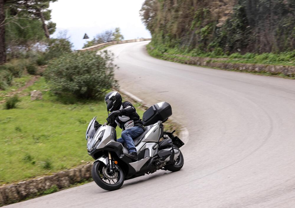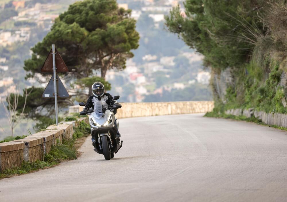 L'erogazione del motore è, rischiamo di ripeterci ma non troviamo una definizione migliore, fluidissima. Fin dalle minime aperture del gas l'ADV 350 scatta in avanti con una grande connessione tra manopola e ruota posteriore, comportamento che aiuta tantissimo nello stop and go urbano. I 29,2 cavalli sono erogati senza incertezze e linearmente, la trasmissione è a punto e nelle statali permette di scegliere una velocità di crociera adeguata per avere comunque una riserva di potenza per fare dei sorpassi, mentre in autostrada i 130 km/h effettivi vengono raggiunti in brevissimo tempo e ci sarebbe ancora margine per allungare ben oltre le velocità codice. Gli esemplari in prova avevano tutti pochissimi chilometri: Honda ci assicura che dopo un adeguato rodaggio le prestazioni velocistiche e la scioltezza alle alte velocità sono destinate ad aumentare ulteriormente. Abbiamo verificato empiricamente i consumi (220 km del nostro test e circa 7,5 litri di rabbocco al termine della giornata) e i 30 km/litro promessi sono stati mantenuti nonostante le esigenze di un lancio stampa non siano le stesse di un economy run.