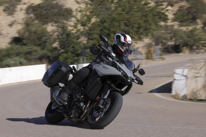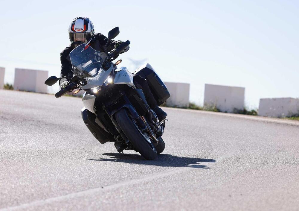 In fatto di dotazioni non manca davvero nulla. Oltre al beneficio delle sospensioni elettroniche e ai differenti riding mode, il parabrezza è regolabile manualmente in cinque posizioni, di serie troviamo manopole riscaldabili su cinque livelli, le valigie laterali (la sinistra con capacità di 37 litri, la destra da 28litri), la comodità della smart key, il cruise control, il cavalletto centrale, gli indicatori di direzione con spegnimento automatico e la segnalazione della frenata d’emergenza per una guida più sicura. Il cruscotto è un TFT da 5”, connesso alla piattaforma Roadsync per integrare navigazione turn by turn, gestione chiamate e multimedia dallo smartphone.