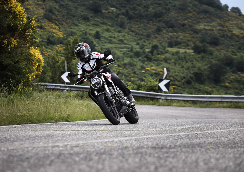 La prima parte del nostro test si svolge sulle ben note - e famigerate - strade di Roma, e subito emergono le doti positive del reparto sospensioni: forcella e "mono" incassano tutti i colpi senza far storie, e solo sugli avvallamenti più importanti si salta un po'. Il riguardo per il comfort non toglie sportività alla ciclistica, e non appena fuori città, sui colli romani, la CB sfodera tutta la sua voglia di scendere in piega con grande agilità nei tratti guidati, e altrettanta stabilità in quelli più veloci. Lode anche al già citato impianto frenante - da rodare sul modello poco chilometrato oggetto della nostra prova, ma le cui capacità che ben ricordiamo, perché gemello a quello della 125: è modulabile, pronto, con un discreto (in senso positivo!) intervento dell'ABS.