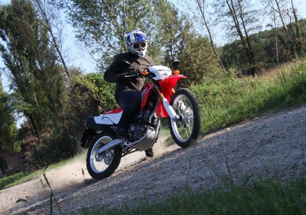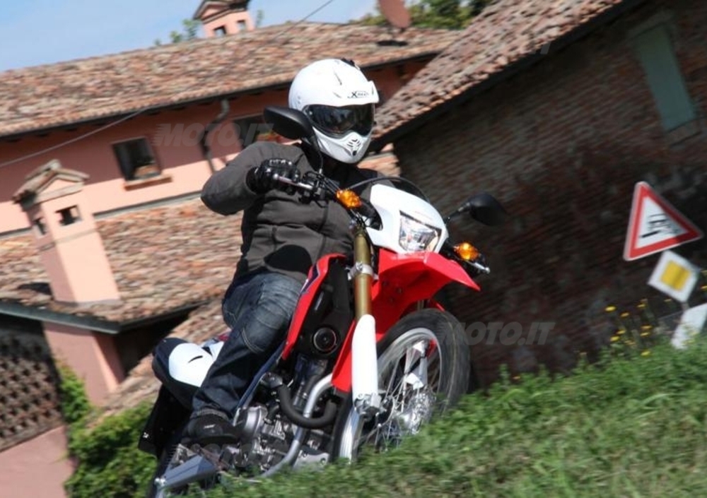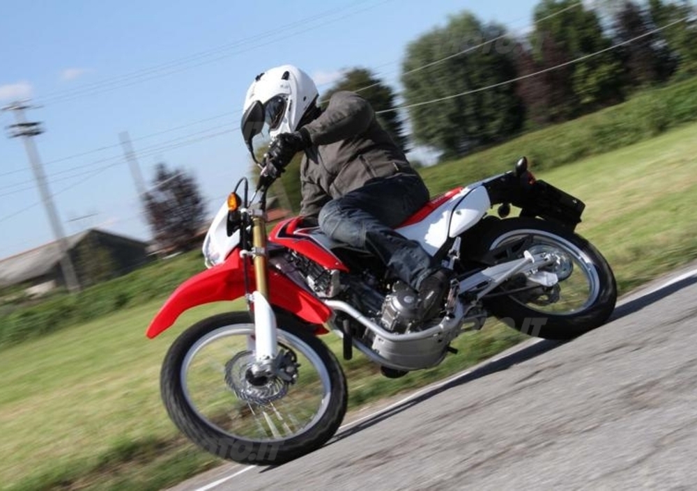 In poche parole: è andata oltre le nostre aspettative, non ci saremmo mai aspettati tanto gusto da una piccola 250 4 tempi. La nuova Honda è invece a suo agio in città, scatta forte al semaforo ed è persino più agile di uno scooter 125. Il suo brillante bialbero le consente poi di tenere alta la testa (ma anche il parafango….) quando si esce dalla metropoli. Regolarissimo anche ai bassi, cambia tono intorno ai 5/6.000 con un’entrata in coppia che invita a giocare con il cambio, ben manovrabile sebbene rapportato un po’ lungo. La CRF L è rapida nel raggiungere i 120 km/h e va anche oltre. Si possono tenere i 130 orari di crociera, per quanto l’avantreno a questa andatura inizi un po’ ad accusare l’effetto vela tipico di tutte le moto a parafango alto.