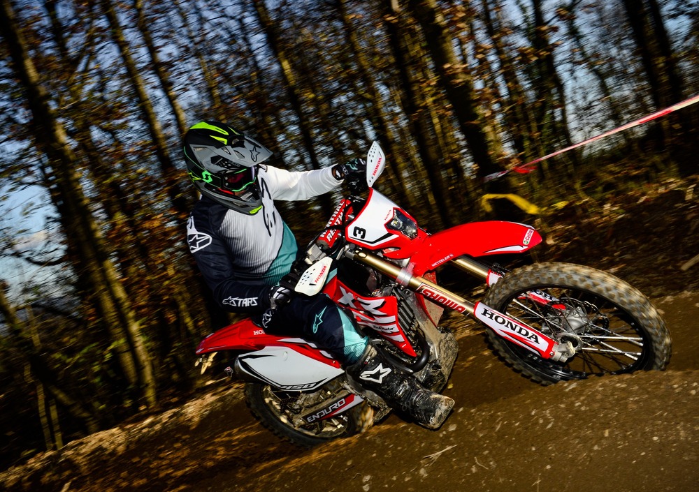 Ed eccoci alla grossa sopresa della Honda. Rispetto alla RX si avverte subito il peso in più (129,8 kg con 7,3 litri di benzina, circa 10 chili più della racing) e una maggiore larghezza tra le gambe. Nello stretto richiede quindi un po' di impegno in più per girare. Per il resto il comportamento è molto vicino alla RX: il telaio è stabile e le sospensioni hanno la stessa ottima scorrevolezza. Sono solo più morbide - e confortevoli - nella prima parte dell'escursione. Il 450 Unicam è qui più dolce nella risposta del gas e si può scaricare la potenza a terra senza troppe difficoltà. La prima marcia corta aiuta a ripartire anche nel brutto, mentre la sesta è adatta ai trasferimenti. Quindi alla fine cosa cambia tra XR e RX? Cambia che con la seconda fai solo enduro vero; con la prima ci vai in fuoristrada, ma non solo. Puoi farti la girata stradale o uscirci la sera con gli amici (tanto c'è la chiave e non ti svuotano il serbatoio). Un limite? Non poterci portare anche il passeggero. Ecco, ma alla fine quanti secondi ballano tra RX e XR a parità di pilota e di percorso? Non ve lo scrivo per non rovinarvi la sorpresa: è tutto nel video sopra.