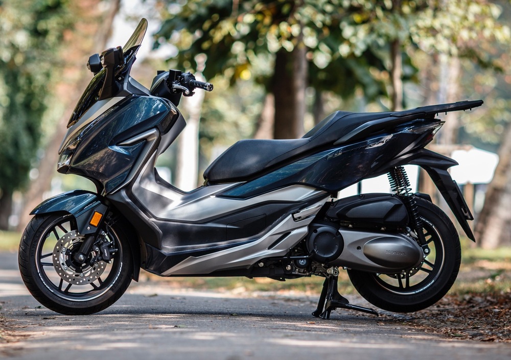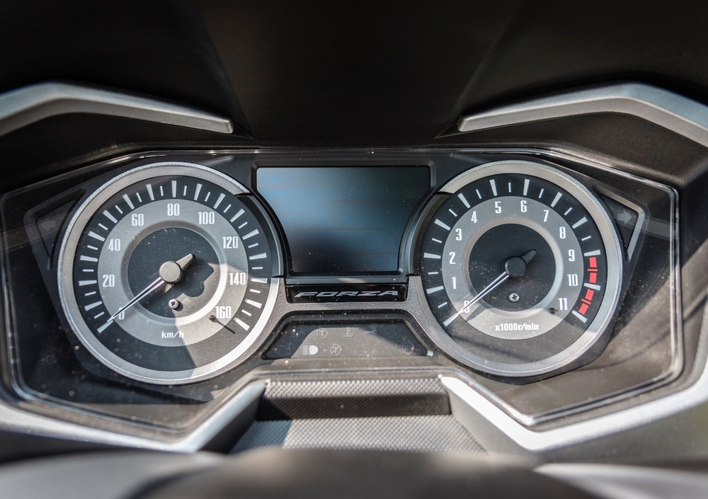 Passiamo al motore, che il Forza condivide – nella base tecnica, al netto di alcuni dettagli – con l’SH 300. La cilindrata si attesta un filo sotto i 280cc, la potenza arriva a 25,2 cavalli. I consumi vanno vicini ai 30 km/L, che visto il serbatoio da 11,5 litri si traducono in una percorrenza di circa 350km.