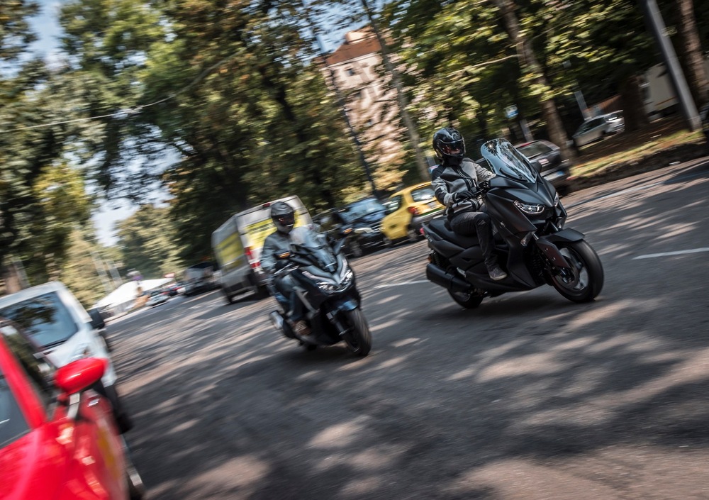 Da un punto di vista più tecnico segnaliamo la soluzione motociclistica (come sul TMAX) della forcella con doppia piastra, anche se a differenza del fratello maggiore al retrotreno troviamo il tipicamente scooteristico doppio ammortizzatore, regolabile su cinque settaggi. I cerchi sono un’accoppiata 15-14”, con pneumatici 120/70 e 140/70 rispettivamente all’avantreno e al retrotreno. Impianto frenante con dischi da 267e 245 mm, per una sostanziale parità con il rivale anche sotto questa voce.