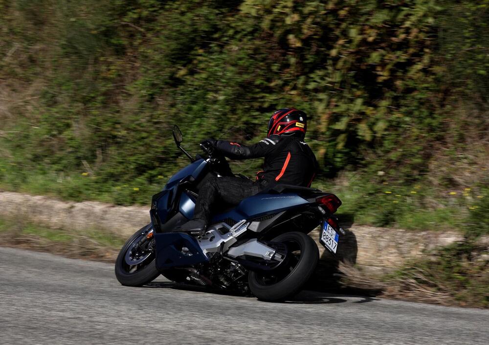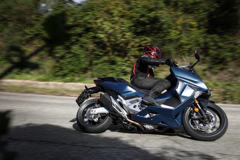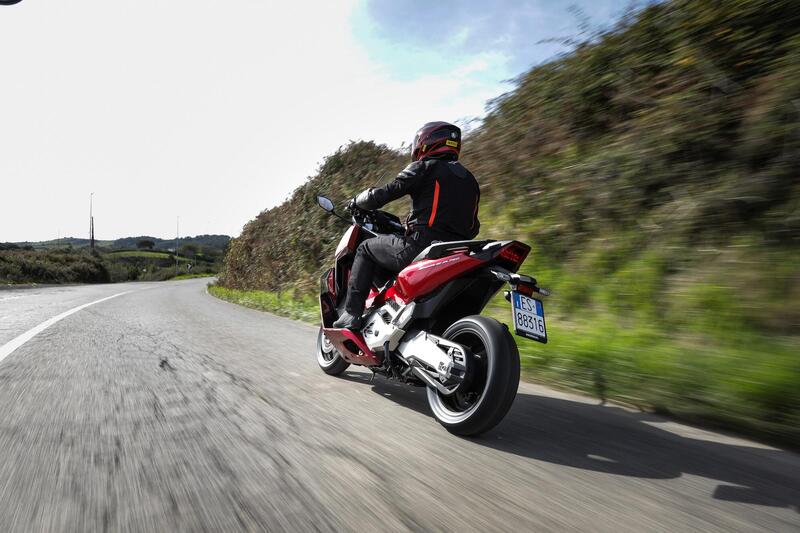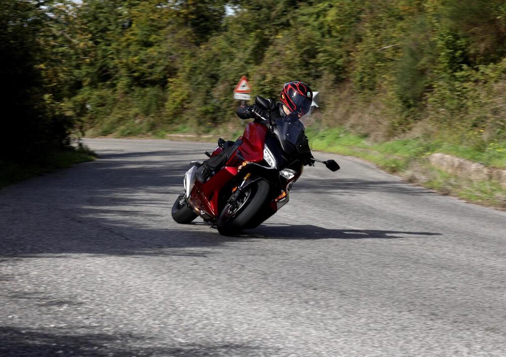 Fuori città, usare il riding mode Sport è una tentazione quasi irresistibile. Le cambiate si fanno cattive, il motore sale bene di giri, e in scalata la “doppietta” è gustosissima: sul misto si gioca con soddisfazione, tanto da dimenticarsi rapidamente di essere in sella a uno scooter (complici le ottime Bridgestone T31 di primo equipaggiamento) salvo sentirselo rapidamente ricordare dai cavalletti che strisciano sull’asfalto.