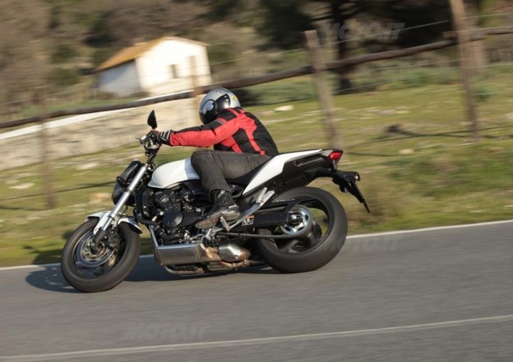 Guidare questa moto, insomma, è un vero piacere. E’ ormai lontano il ricordo della odiata (parlo per me, sia chiaro) prima versione, tanto carina esteticamente (quindi vendutissima, ovvio, no?) quanto pessima da guidare, con quella insulsa ruota anteriore da 16” dal gommone largo e con le sospensioni delle bambole. Con il sospirato avvento della ruota anteriore da 17”, sulla seconda serie, la naked di Honda ha iniziato a migliorare costantemente, fino a raggiungere i livelli davvero soddisfacenti delle ultime versioni. Stabilissima in ogni frangente, l’Hornettina sfreccia sicura anche a tutta birra (siamo in prossimità dei 230 orari effettivi) in rettilineo come sui curvoni lunghi, mentre sul misto, stretto o veloce che sia, non si fa certo pregare per impostare una curva e seguirne la traiettoria desiderata, né tantomeno per affrontare una bella “esse” a passo spedito: basta pensarlo, e via. E le sospensioni hanno una buona taratura di base, che rende il mezzo sempre ben gestibile: non sono flaccide, ma ben controllate e più che discretamente confortevoli anche sullo sconnesso non esasperato, vedi pavé e asfalto sbucciato. Sembra tutto facile, in sella a questa moto, e in effetti è così, in città come fuori. Il motore stesso è gradevolissimo. Certo che non stiamo parlando di un mostro dalla coppia taurina, qualità in effetti difficile da trovare laddove frullino quattro pistoncini da 67 mm di diametro. Ma è la sua fruibilità a renderlo amabile, a partire dal fatto che può riprendere in sesta da circa 1.500 giri senza strappi, e man mano che vien su si rinvigorisce progressivamente fino alla "zona rossa" del contagiri. E qui faccio un inciso: ci vuole una vista d’aquila per leggere la scala troppo piccola del contagiri digitale, specie col sole di fronte.