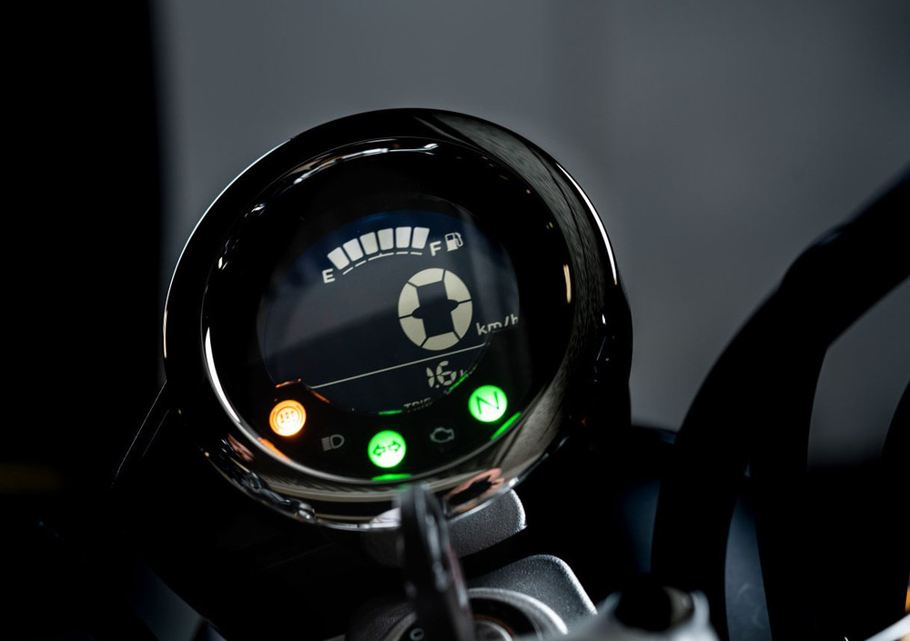 Il tutto ovviamente rivisitato in chiave moderna con colori accesi e specchi, manubrio e parafanghi - ovviamente - cromati; un bel serbatoio da 5,6 litri con verniciatura in doppio colore e con la tinta della carrozzeria (gialla o rossa in Italia) che si intona col mono posteriore e addirittura col telaio.