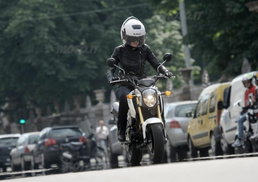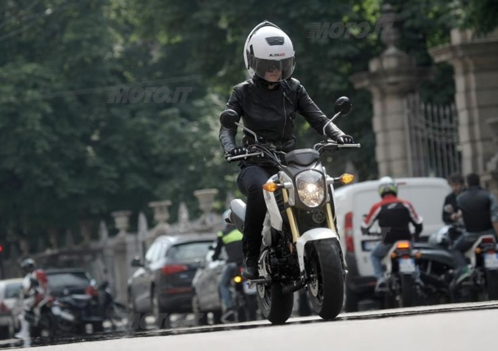 Una volta in marcia MSX non finisce di stupirci: la frizione multidisco in bagno d’olio è estremamente docile, il cambio preciso e la risposta del gas pronta e scattante, complice anche il peso decisamente ridotto: 101,7 kg in ordine di marcia, col pieno di benzina. Il peso piuma si percepisce anche in marcia e l’agilità della MSX è paragonabile, se non superiore, a quella di uno scooter. Nel traffico milanese se l’è cavata alla grande, svicolando con nonchalance tra le auto e attirando su di sé non pochi sguardi incuriositi a ogni semaforo.