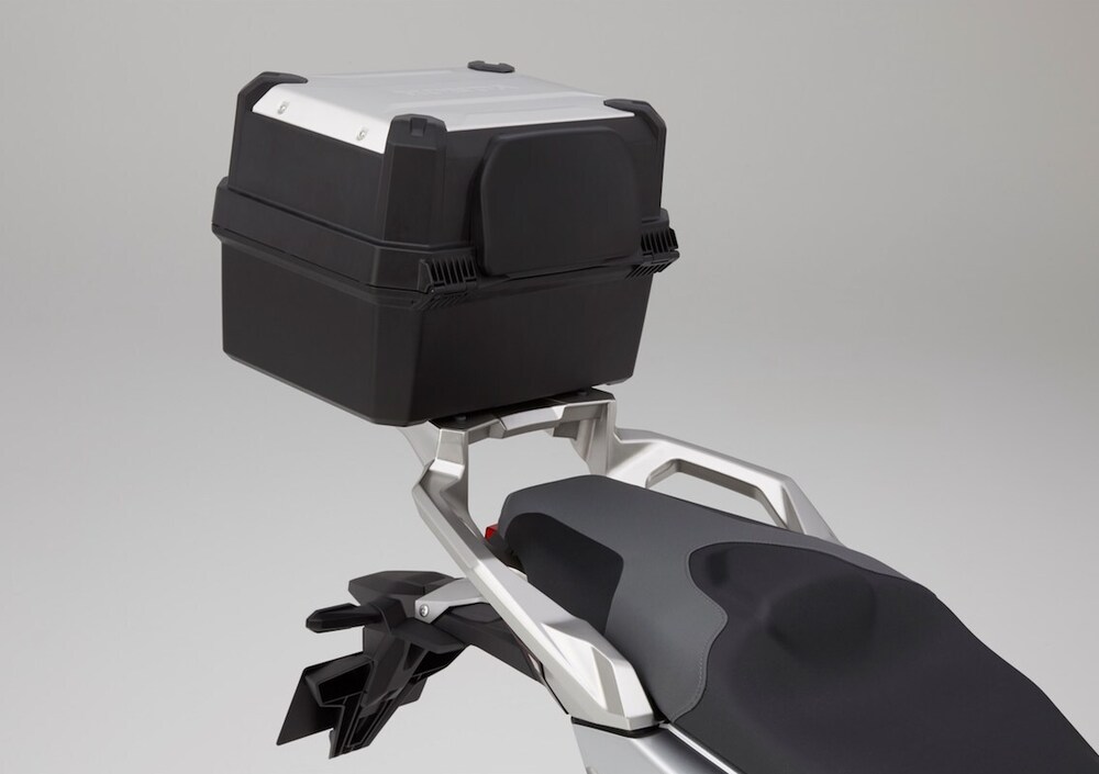 La creazione di uno spazio sottosella capace di ospitare un casco integrale con frontino fa sì che il top box non venga offerto di serie, ma resti disponibile in due versioni (da 35 o 45 litri, rispettivamente con cover in alluminio o in tinta con la carrozzeria), capaci di ospitare lo schienalino per il passeggero. Il portapacchi con maniglie integrate è invece ovviamente parte della dotazione di serie. Ma se vi interessa l’X-ADV vale la pena muoversi, perché chi lo ordinerà entro fine mese riceverà in omaggio il top box in alluminio (quello da 35 litri) e, limitatamente ai primi 1.000 clienti, il navigatore Tom Tom Vio.