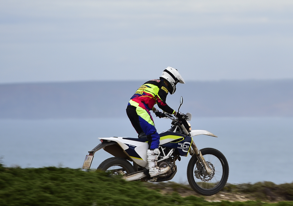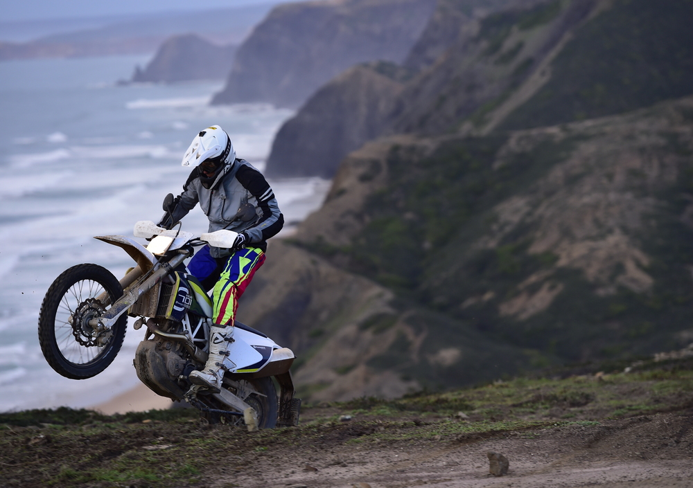 Le premesse sono buone. Non ci resta che metterla alla prova sui fantastici percorsi del Portogallo, resi viscidi dalla pioggia caduta nelle ore che hanno preceduto il nostro test. La posizione in sella è comoda e molto simile a quella di una moto da enduro da competizione. C’è più spazio e la sella nuova (appositamente costruita in Canada per Husqvarna) è molto confortevole. Si rivela un po’ scivolosa, nonostante la zigrinatura, ma ha il pregio di assorbire tutte le vibrazioni indirizzate alle chiappe di pilota e passeggero (in questo è nettamente migliore rispetto alla sella montata sulla cugina KTM 690 Enduro). Le vibrazioni sono invece ben presenti sulle pedane e soprattutto sul manubrio e disturbano nei trasferimenti stradali con alte velocità di crociera.